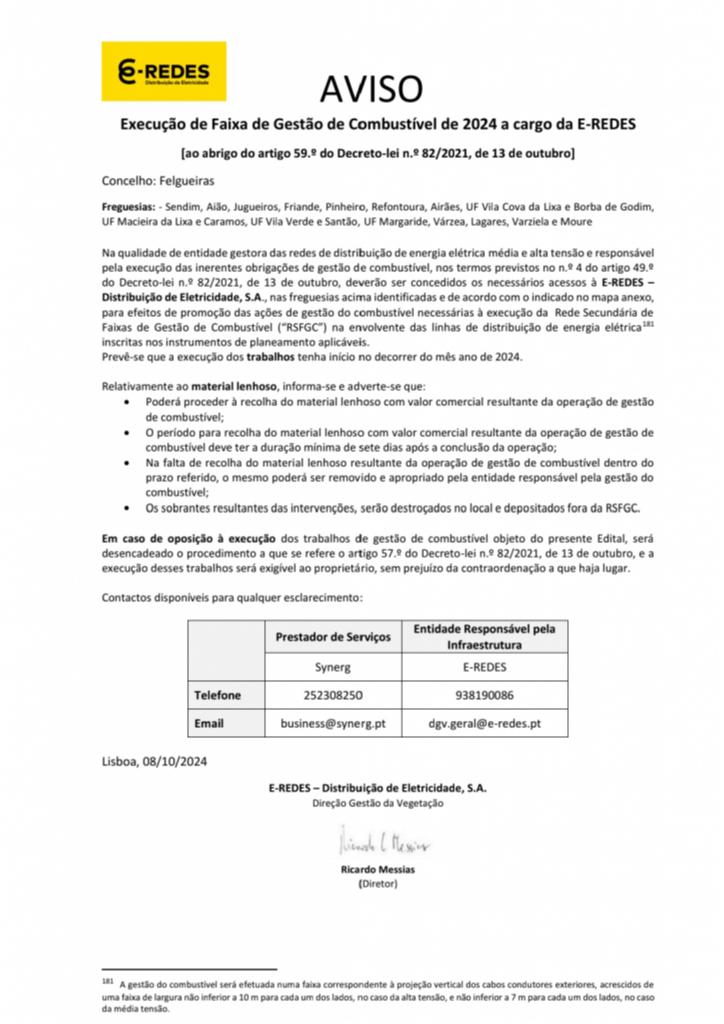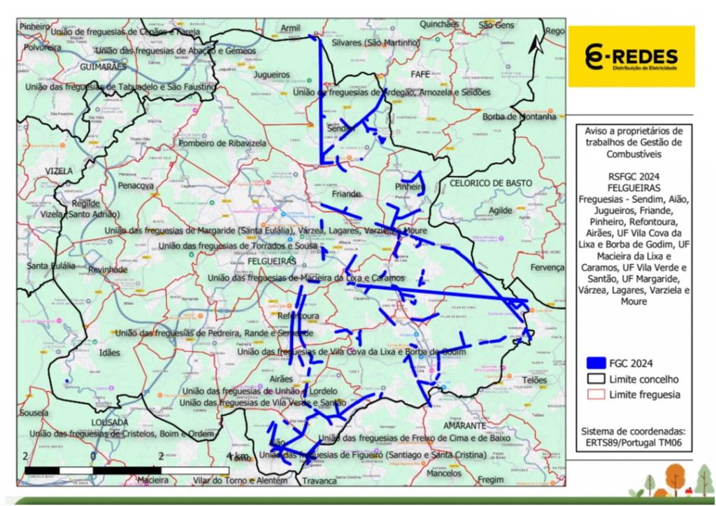 O Município de Felgueiras, informa que a E-REDES – Distribuição de Eletricidade, S.A. vai promover ações de gestão do combustível, nas freguesias de Friande, Sendim, Aião, Jugueiros, Pinheiro, Refontoura, Airães, UF Vila Cova da Lixa e Borba de Godim, UF Macieira da Lixa e Caramos, UF Vila Verde e Santão, UF Margaride, Várzea, Lagares, Varziela e Moure nas faixas das linhas de Alta e Média Tensão.